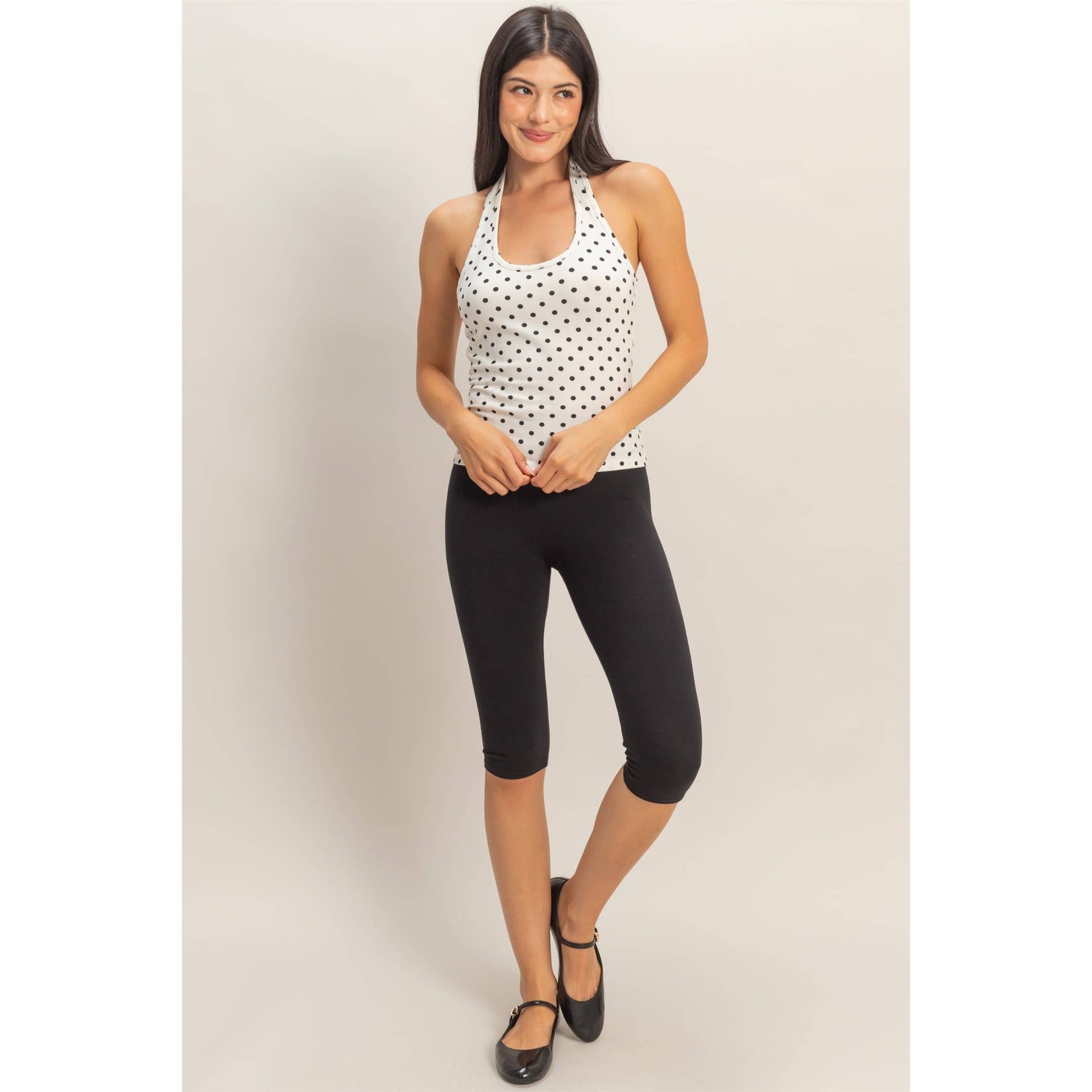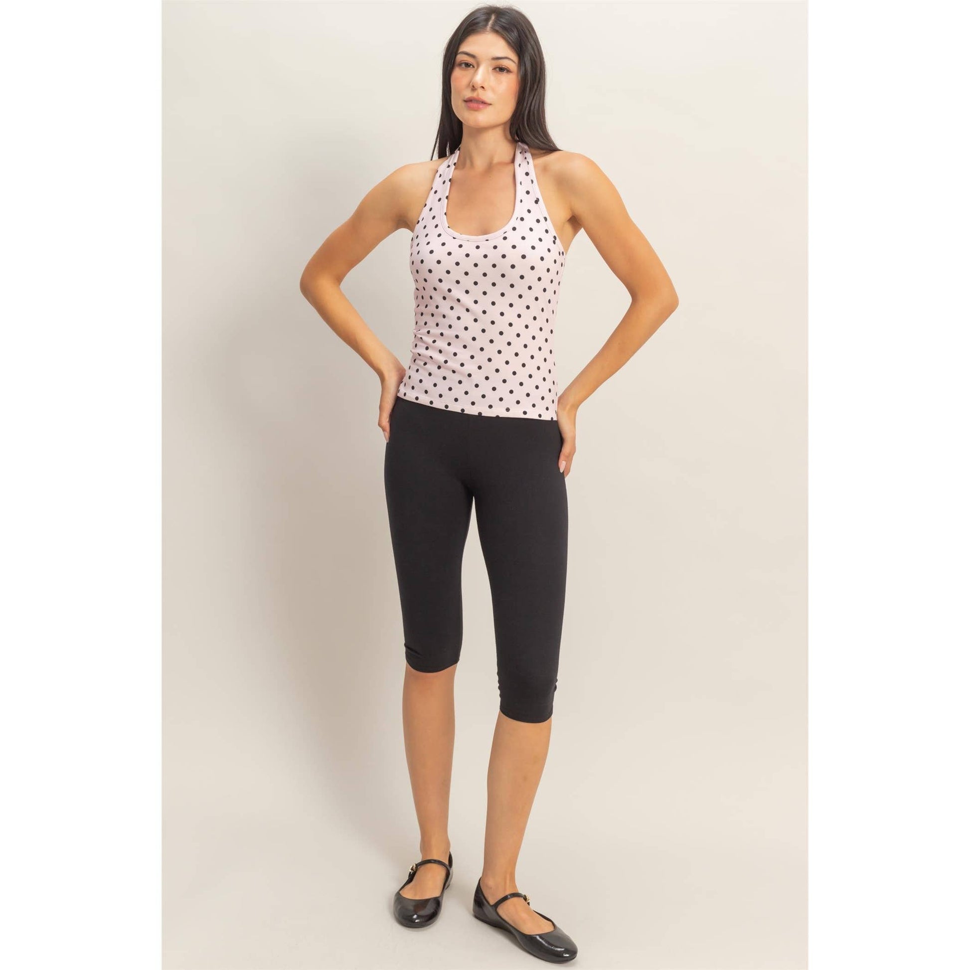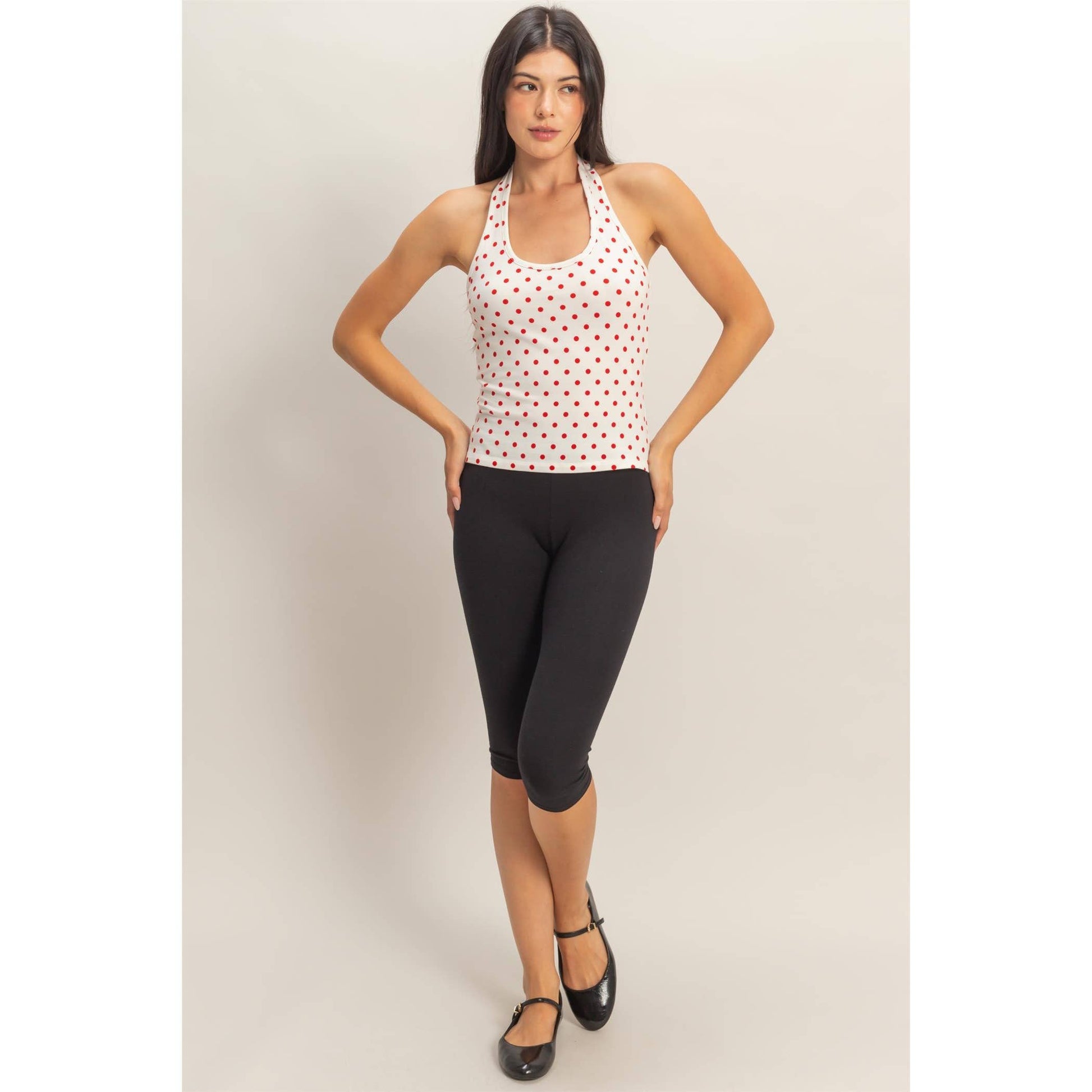 Exude vintage charm in this polka dot halter top, crafted from a soft cotton-spandex blend. It highlights a classic halter neckline with wide straps that frame the shoulders. The form-fitting silhouette contours the body for a sleek profile. Pair with denim shorts and espadrilles for a chic, effortless summer outfit.